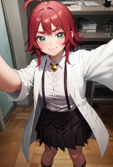 For small kusuri use: s_kusuri_wz, red hair, short hair, ahoge, green eyes, thick eyebrows, short eyebrows, labcoat, socks, white shirt, black skirt, long sleeves, collared shirt, suspenders, brooch, pleated skirt, white coat