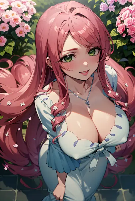 Triggers: hahari_wz, pink hair, very long hair, drill hair, green eyes, pink lips, cleavage, white dress, necklace, jewelry, huge breasts, flower, hair ornament