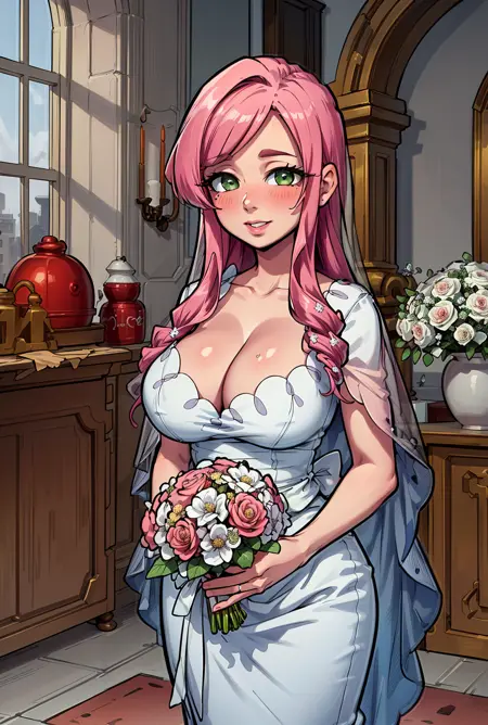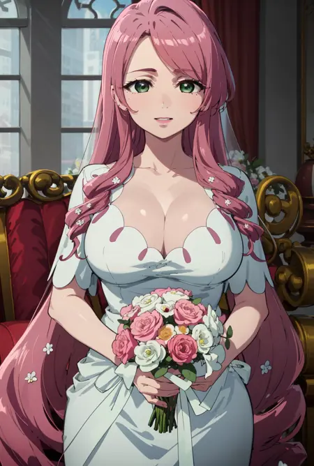 Triggers: hahari_wz, pink hair, very long hair, drill hair, green eyes, pink lips, cleavage, white dress, necklace, jewelry, huge breasts, flower, hair ornament