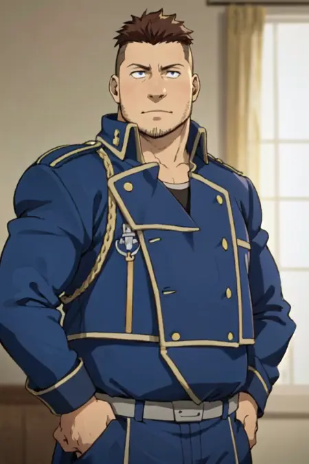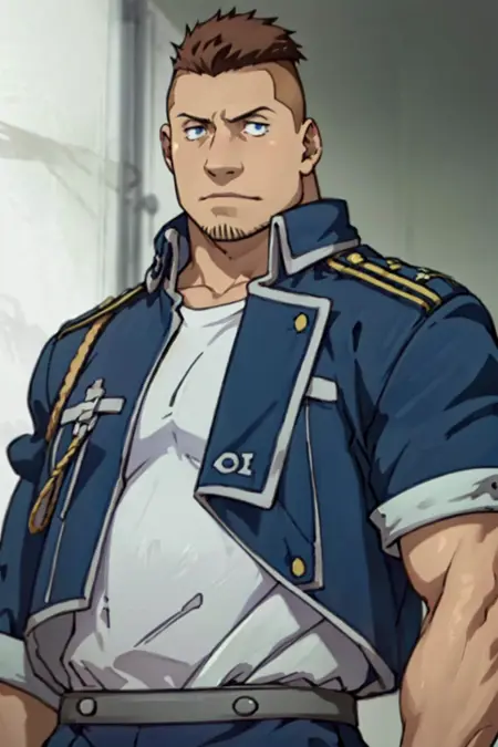 프롬프트: 헤이만스 브레다, 갈색 머리, 단발, 어두운 눈, 삼파쿠, 수축된 동공, 차분한 눈빛, 처진 눈, 안면 털, 수염, 통통한 체형, 아메스트리스 국군 복장(풀메탈 알케미스트), 흰색 속옷, 파란 재킷(풀메탈 알케미스트), 긴 소매 재킷, 짧은 재킷, 파란 바지, 아메스트리스 파란 허리 망토(풀메탈 알케미스트), 회색 허리띠