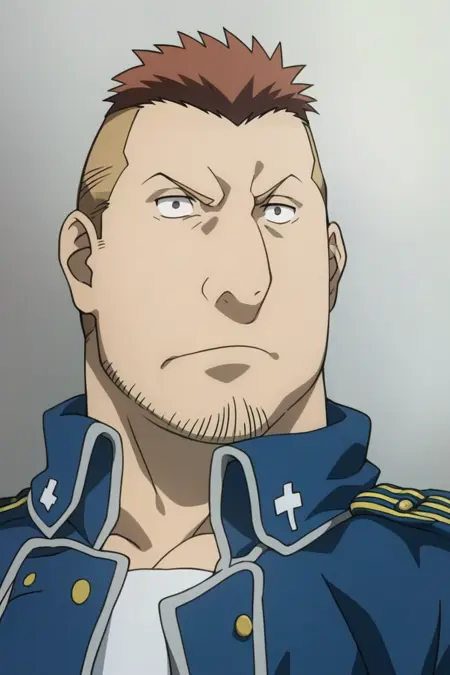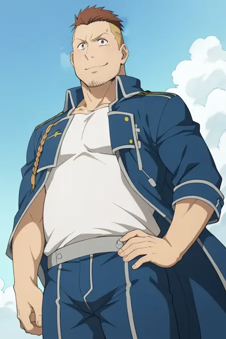 프롬프트: 헤이만스 브레다, 갈색 머리, 단발, 어두운 눈, 삼파쿠, 수축된 동공, 차분한 눈빛, 처진 눈, 안면 털, 수염, 통통한 체형, 아메스트리스 국군 복장(풀메탈 알케미스트), 흰색 속옷, 파란 재킷(풀메탈 알케미스트), 긴 소매 재킷, 짧은 재킷, 파란 바지, 아메스트리스 파란 허리 망토(풀메탈 알케미스트), 회색 허리띠