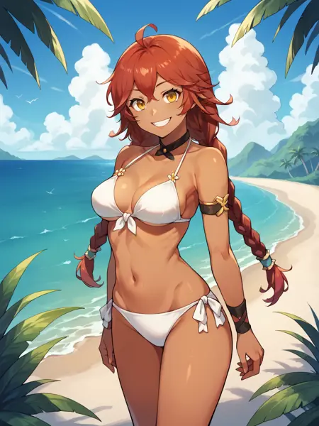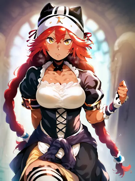 基本プロンプト:score_9, source_anime, 1girl, red hair, long hair, twin braids, yellow eyes, dark skin