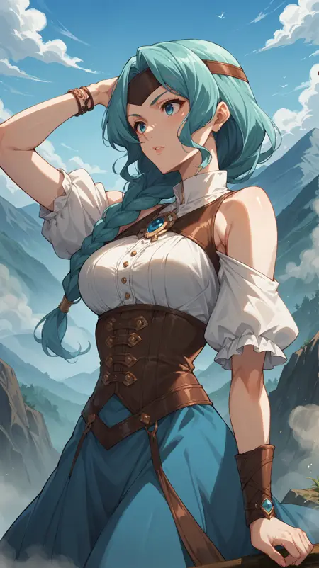 aqua hair, single braid, long hair, blue eyes, headband, bare shoulders, white shirt, leather corset, bracelets, blue dress, long dress,