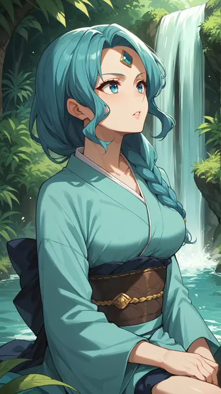 aqua hair, single braid, long hair, blue eyes, aqua kimono, blue forehead jewel,