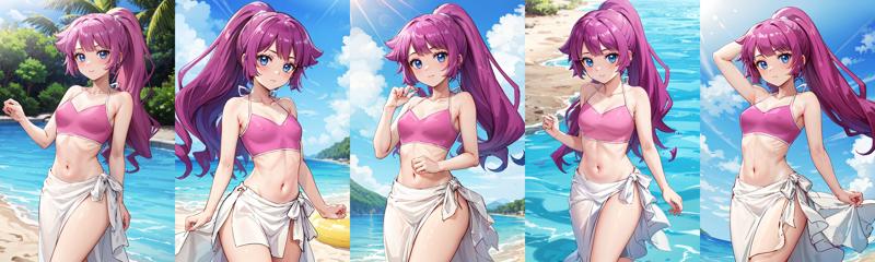 - bbromin,long hair,ponytail,bangs,swimsuit,bikini,pink bikini,midriff,sarong,white skirt