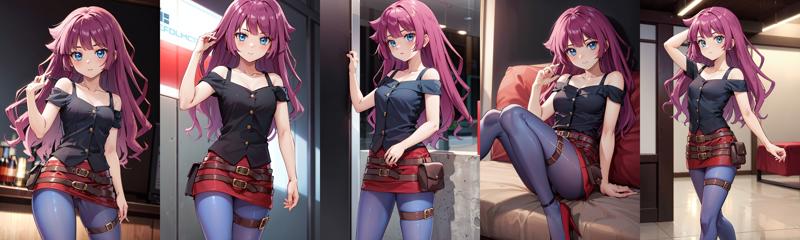 - aaromin,long hair,bangs,off shoulder,black shirt,belt,red skirt,pantyhose,blue pantyhose,thigh strap,high heels,red footwear