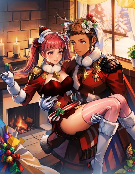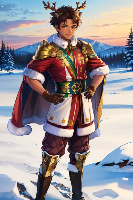 Winter Claude: xmasClaude, gloves, animal ears, reindeer antlers, deer ears, boots, dark skin, cape, fur trim, bell, shoulder armor, santa costume