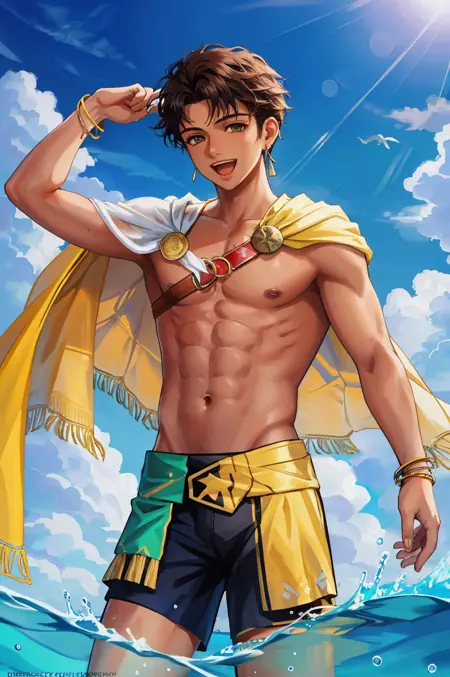 Tropical Trouble: sumClaude, navel, sunglasses, cape, earrings, bracelet, male swimwear, dark skin, sandals
