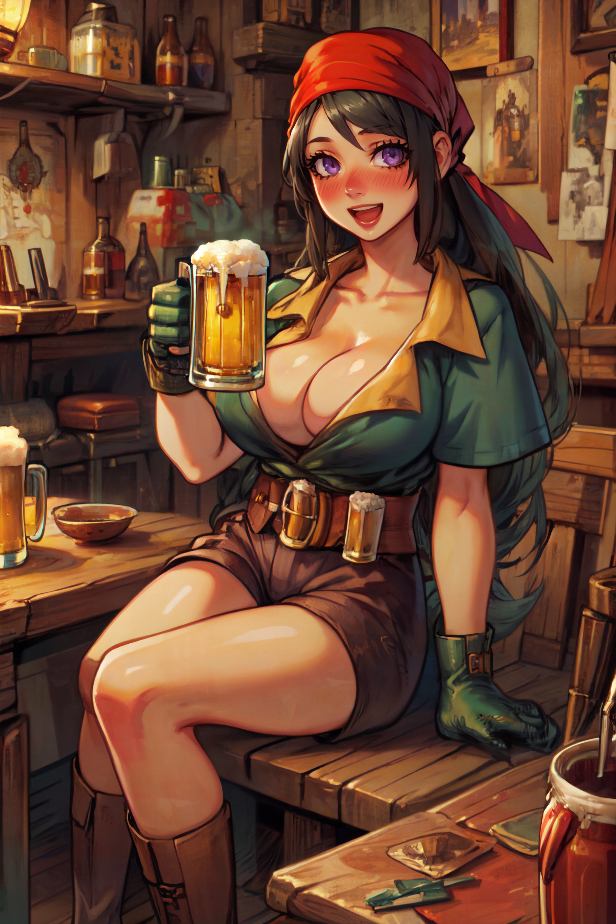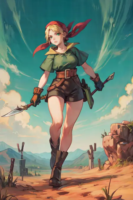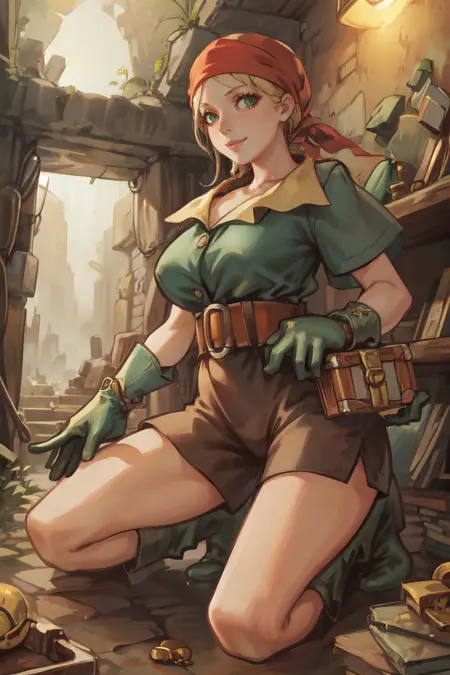 The generic Thief job from Final Fantasy Tactics. As usual, her physical features are not baked in the main tag, so it works like a costume lora if you want to. The dataset available was a lot smaller for Thief than the other classes I've done so far, but it still turned out alright. A few of the images had her showing a lot of cleavage and in the smaller dataset it skewed the model a little bit, so it will occasionally generate her with a lot of cleavage. Just put "cleavage" in the negatives if you want her shirt buttomed-up higher.