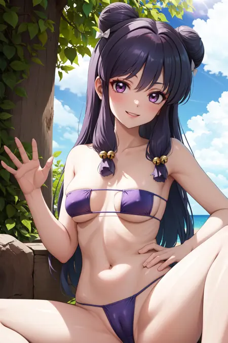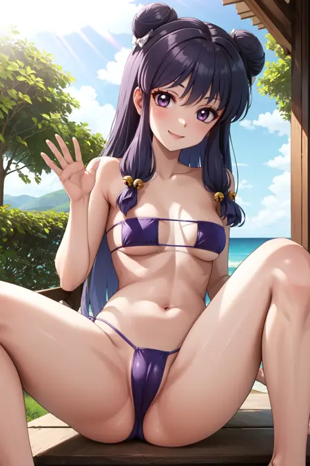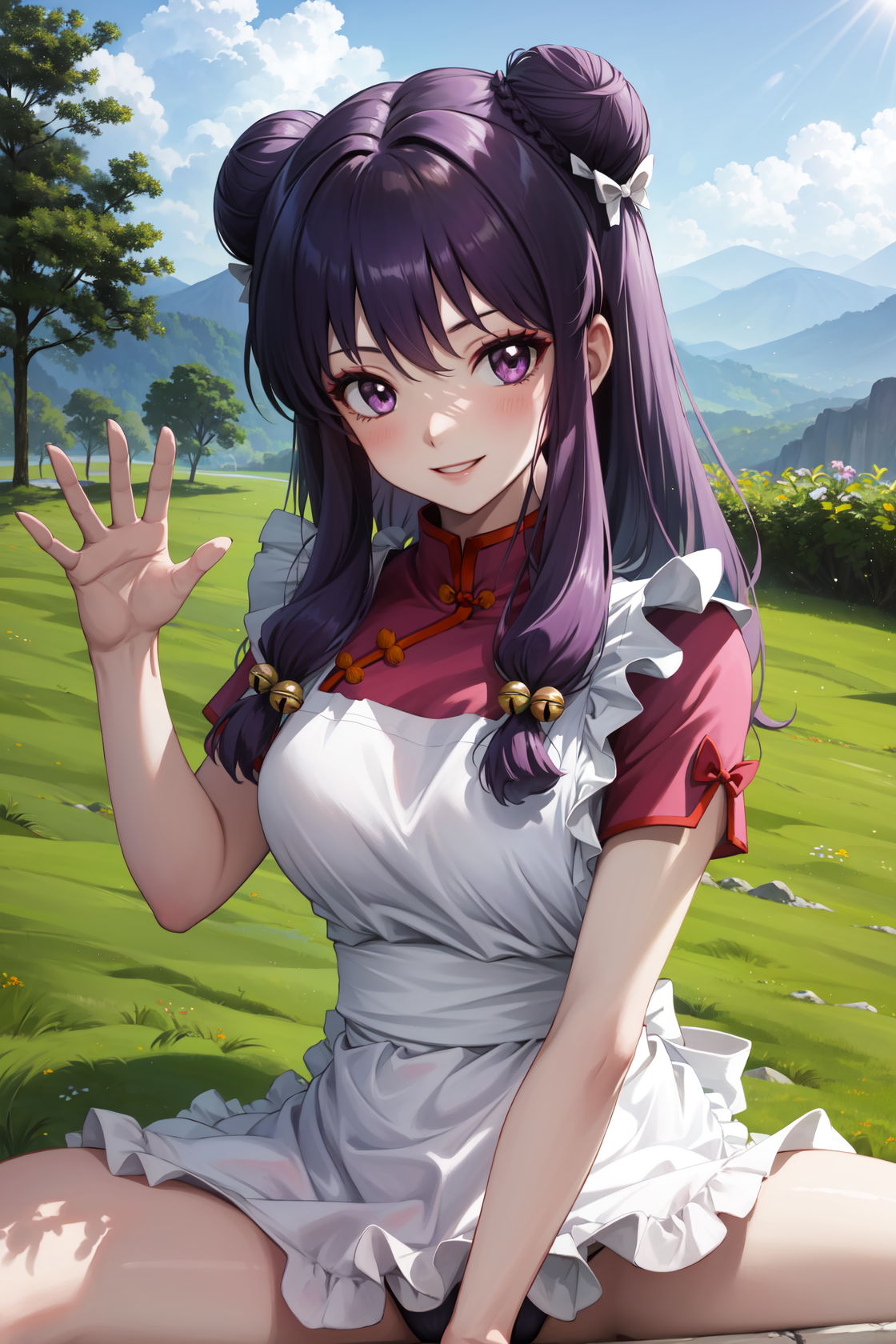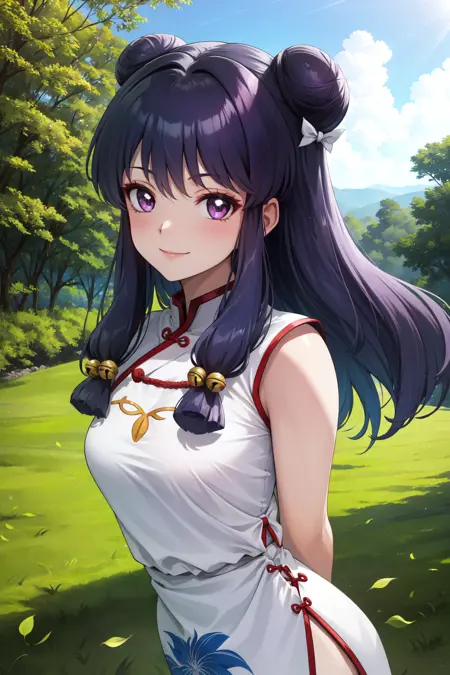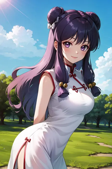 purple eyes, purple hair, hair bun, bell, double bun, jingle bell, long hair, breasts, blush, smile, bangs, hair ornament, bow, sidelocks, shampoo (ranma 1/2);