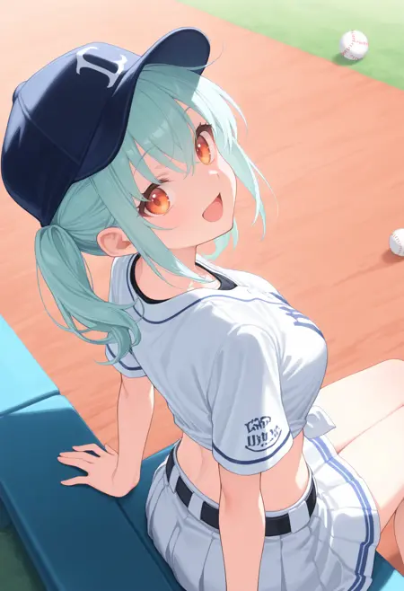トリガーだけでも問題ないですが baseball, baseball cap, baseball uniform, hat, blue headwear,white shirt, clothes writing, short sleeves 辺りを入れると安定します。素材がほぼ全てホームユニフォームなのでビジターユニフォームや埼玉ユニフォームは基本出せません。一応white shirtの代わりに(blue shirt:2)で胸の文字は本来とは違いますが色はビジターっぽくできます。