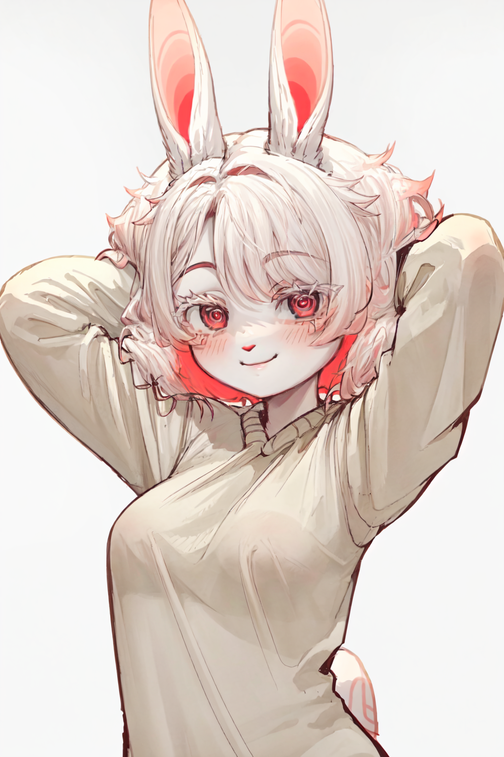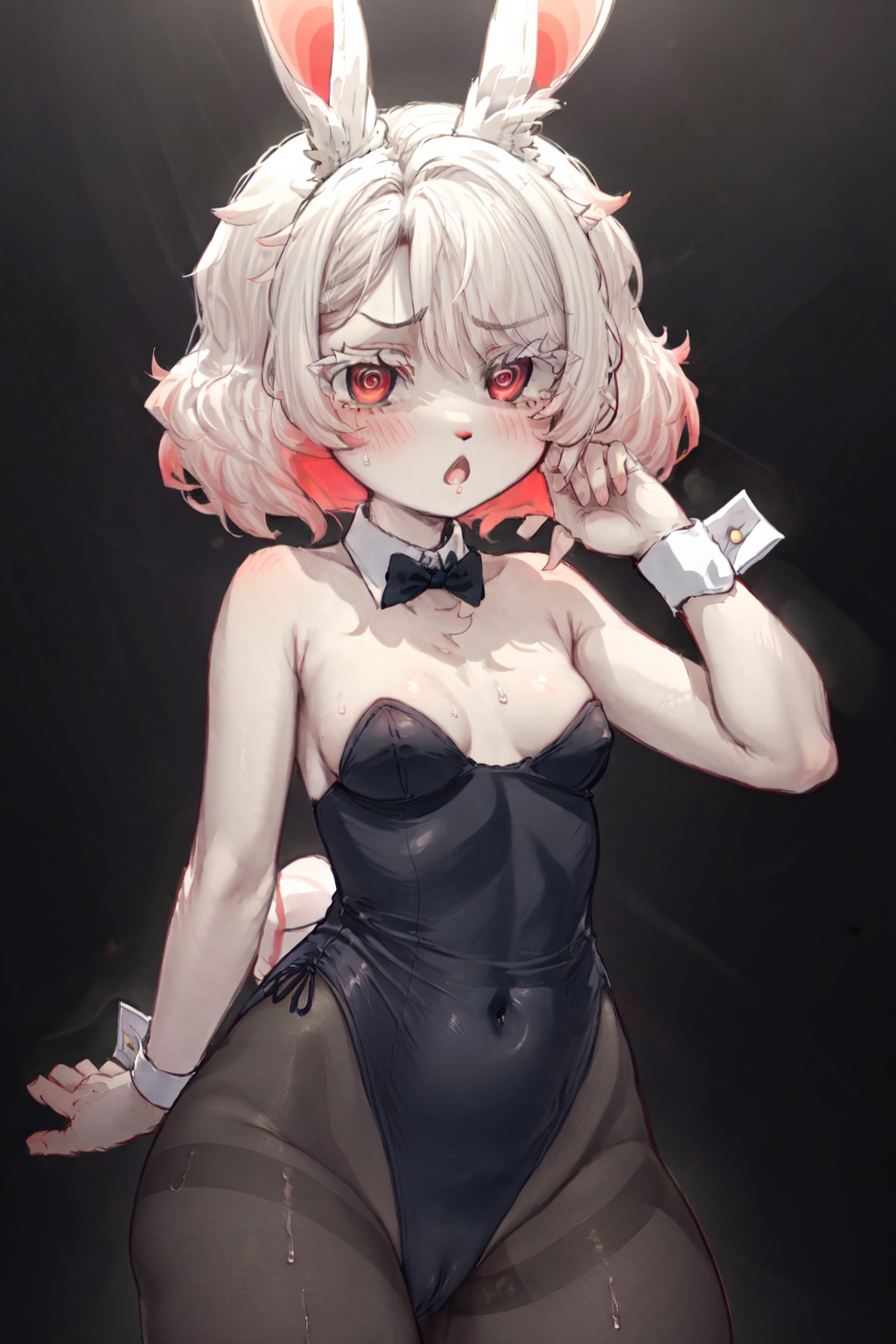 Prompts are : Imabunbun, furry, rabbit girl, rabbit ears, two-tone hair, white fur, red eyes, spiral eyes, animal nose, short hair