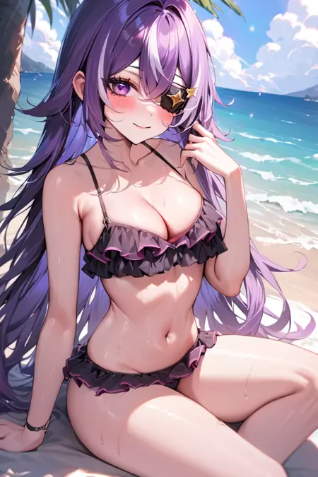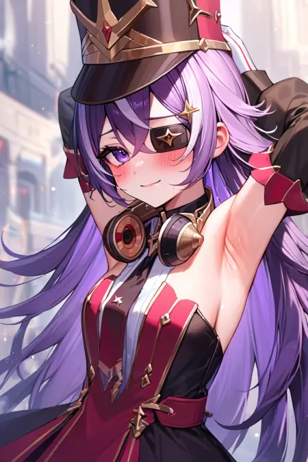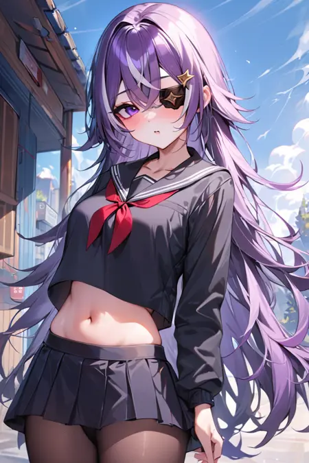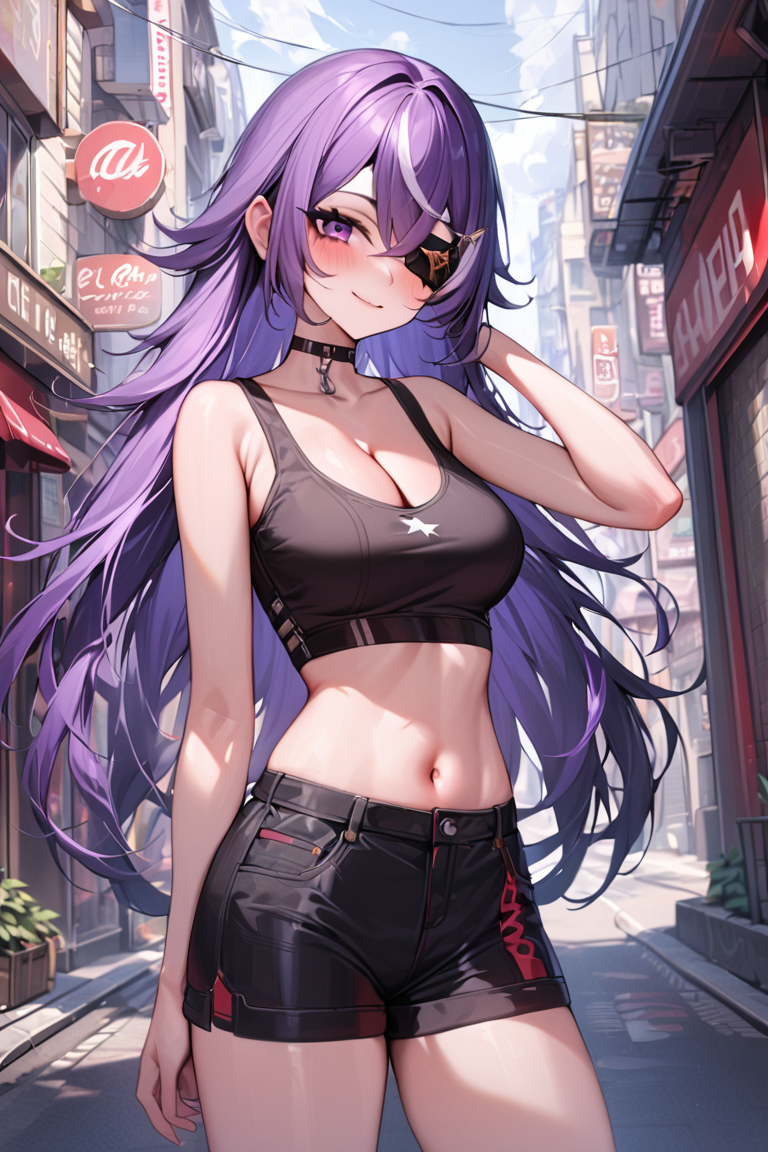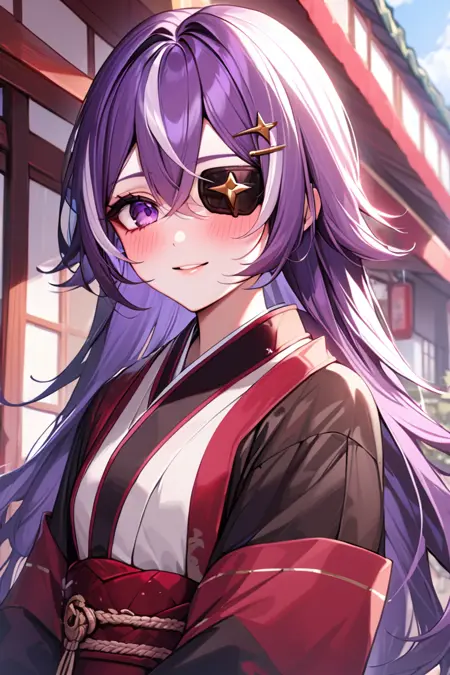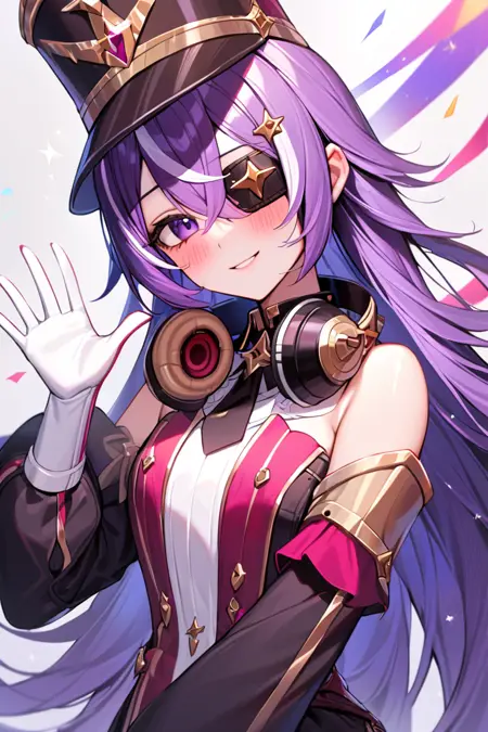 Trigger Words: ``chevreuseexp, purple hair, white streaks, long hair, Purple eyes, eye patch, hair clip, star clip``