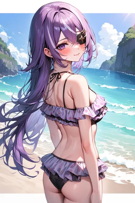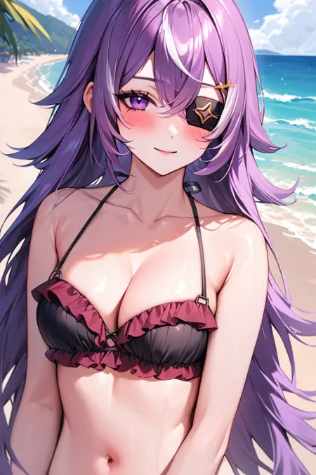 トリガー語: chevreuseexp, 紫の髪, 白いストライプ, 長い髪, 紫の目, 目当て, ヘアクリップ, 星のクリップ