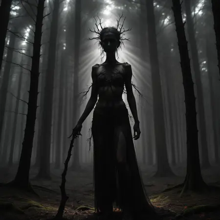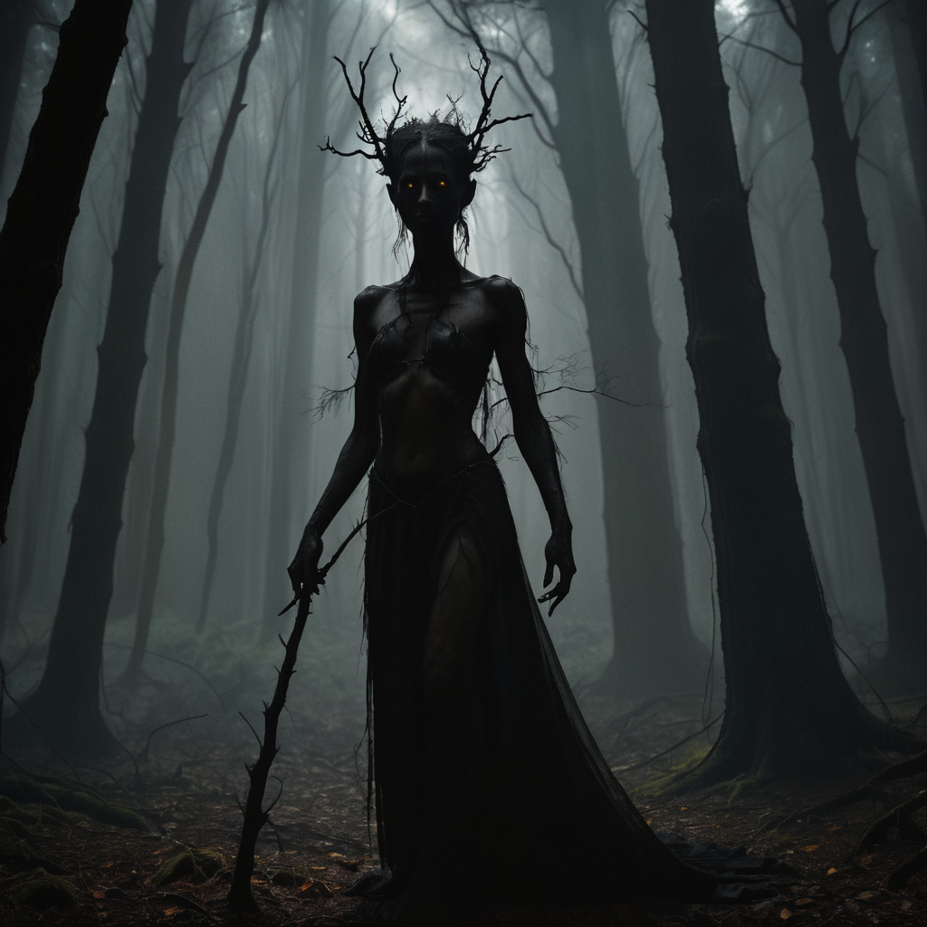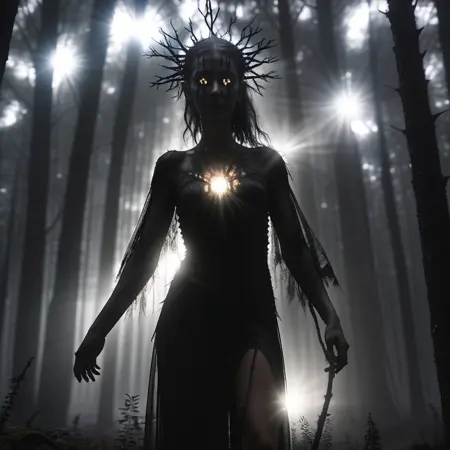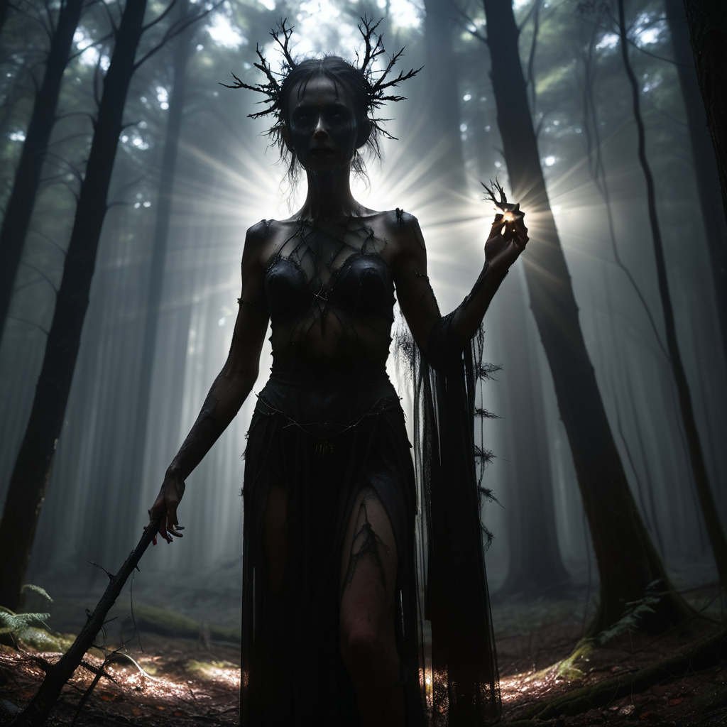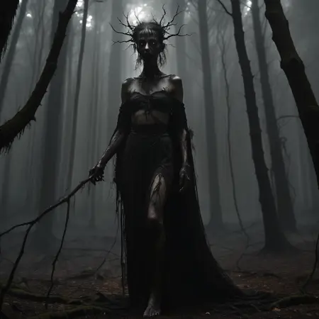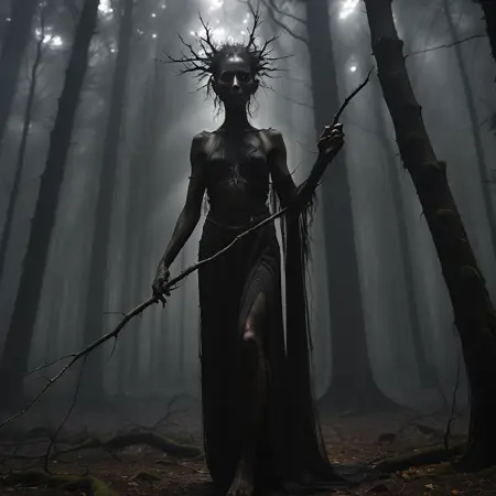 1girl, 1other, antlers, arms at sides, bare shoulders, barefoot, belt, black dress, black hair, blindfold, blood, blood on clothes, blood on face, boots, bracelet, branch, breasts, cape, cleavage, closed mouth, collarbone, crown, dark, dirty, dirty feet, dress, facing viewer, fog, forest, from side, full body, gloves, grass, hair bun, holding, holding staff, holding sword, holding weapon, hood, jewelry, long hair, looking at viewer, mask, medium breasts, midriff, nature, navel, navel piercing, necklace, nipples, outdoors, pale skin, ponytail, profile, realistic, short hair, sickle, single hair bun, skirt, skull, solo, staff, standing, strapless, sword, tree, tube top, underboob, upper body, ur black druid, walking, weapon, white hair,