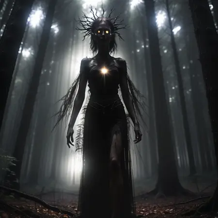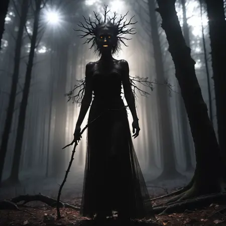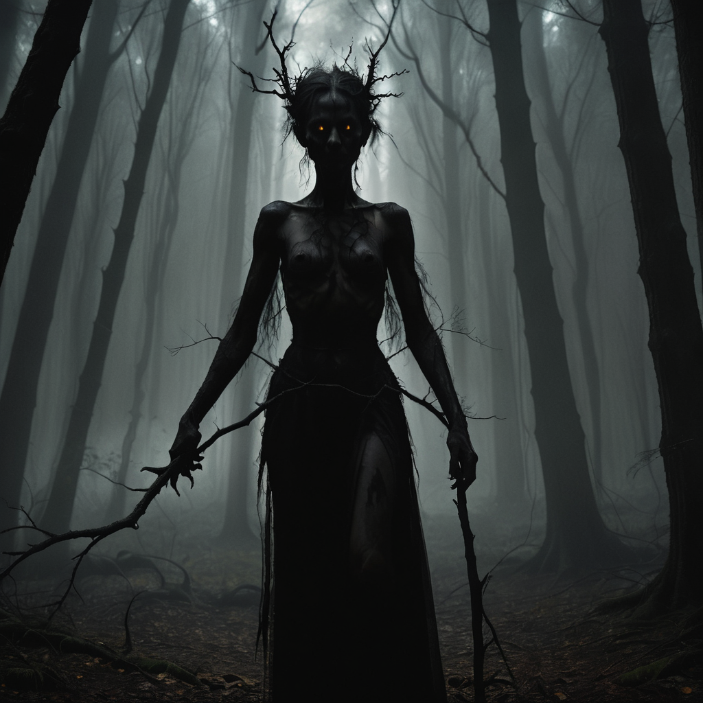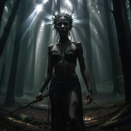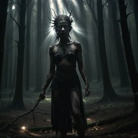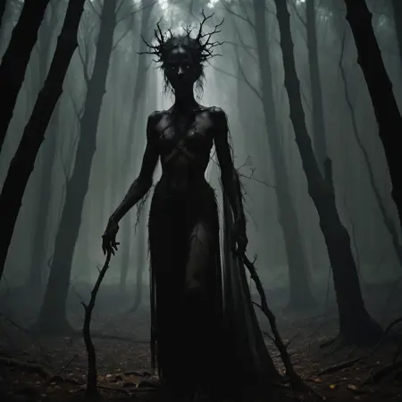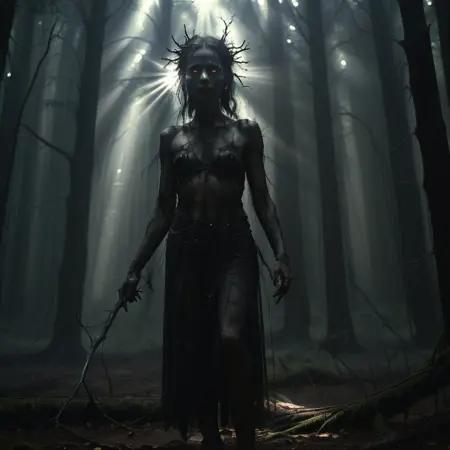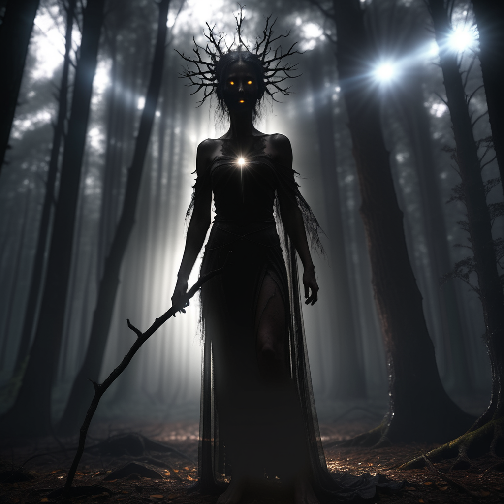 1girl, 1other, antlers, arms at sides, bare shoulders, barefoot, belt, black dress, black hair, blindfold, blood, blood on clothes, blood on face, boots, bracelet, branch, breasts, cape, cleavage, closed mouth, collarbone, crown, dark, dirty, dirty feet, dress, facing viewer, fog, forest, from side, full body, gloves, grass, hair bun, holding, holding staff, holding sword, holding weapon, hood, jewelry, long hair, looking at viewer, mask, medium breasts, midriff, nature, navel, navel piercing, necklace, nipples, outdoors, pale skin, ponytail, profile, realistic, short hair, sickle, single hair bun, skirt, skull, solo, staff, standing, strapless, sword, tree, tube top, underboob, upper body, ur black druid, walking, weapon, white hair,