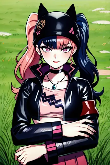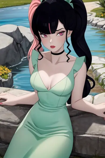 zoe rayne, 1girl, twintails, split-color hair, pink eyes, pink hair, black hair, long hair, blunt bangs, medium breasts, pale skin, sidelocks