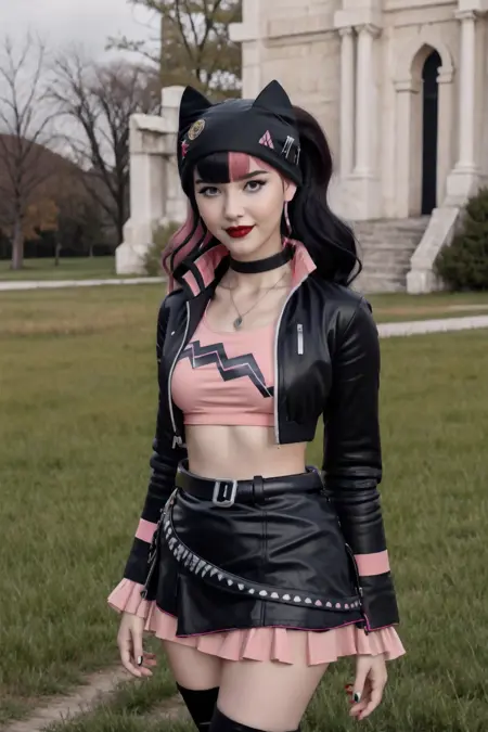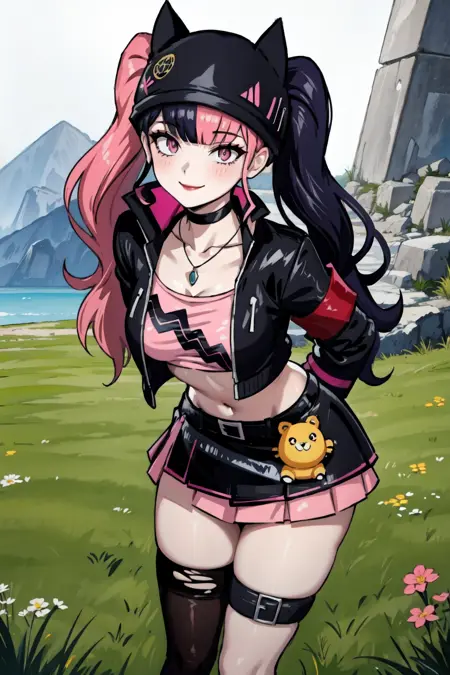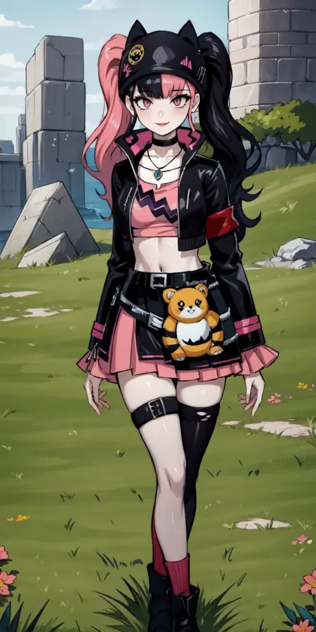 pink cropped tank top, pink pleated skirt, black cropped jacket, black overskirt, black belt, thigh strap, black single thighhigh, red and black single sock, black boots, black cat hat, stuffed animal, pink traingle, skull print, necklace, pendant, black choker