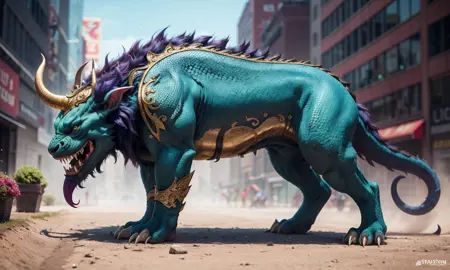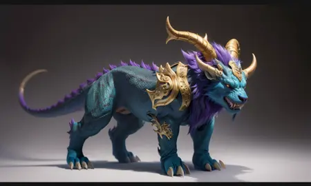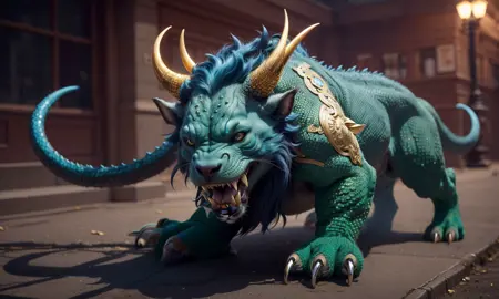 좋은 프롬프트: 4개의 다리, 뿔, 화려한 색상, 사나움, 금색, 갑옷, 다채로움, 비늘, 꼬리, 화려함, 발톱, 털