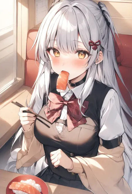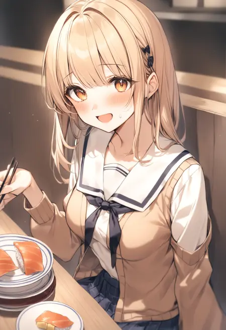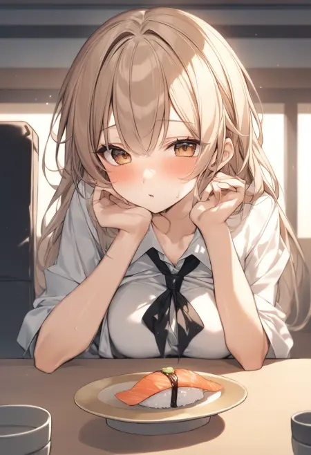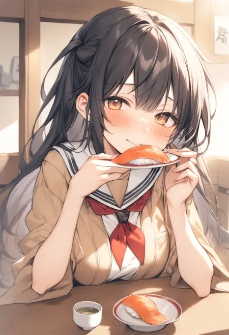 我认为如果不加入nigirizushi、restaurant、holding chopsticks、sitting、table等元素,生成效果会更好。请尝试不同的LoRA组合及权重,找到最佳效果。