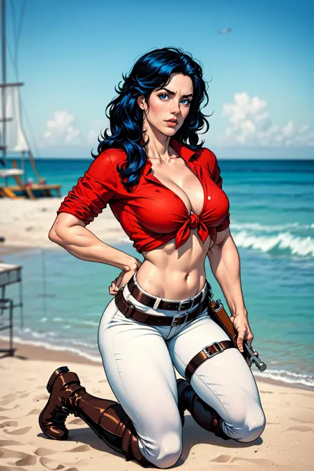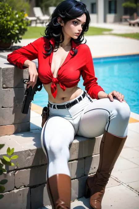 also: red shirt, tied shirt, belt, holding gun, gun, holster, white pants, boots