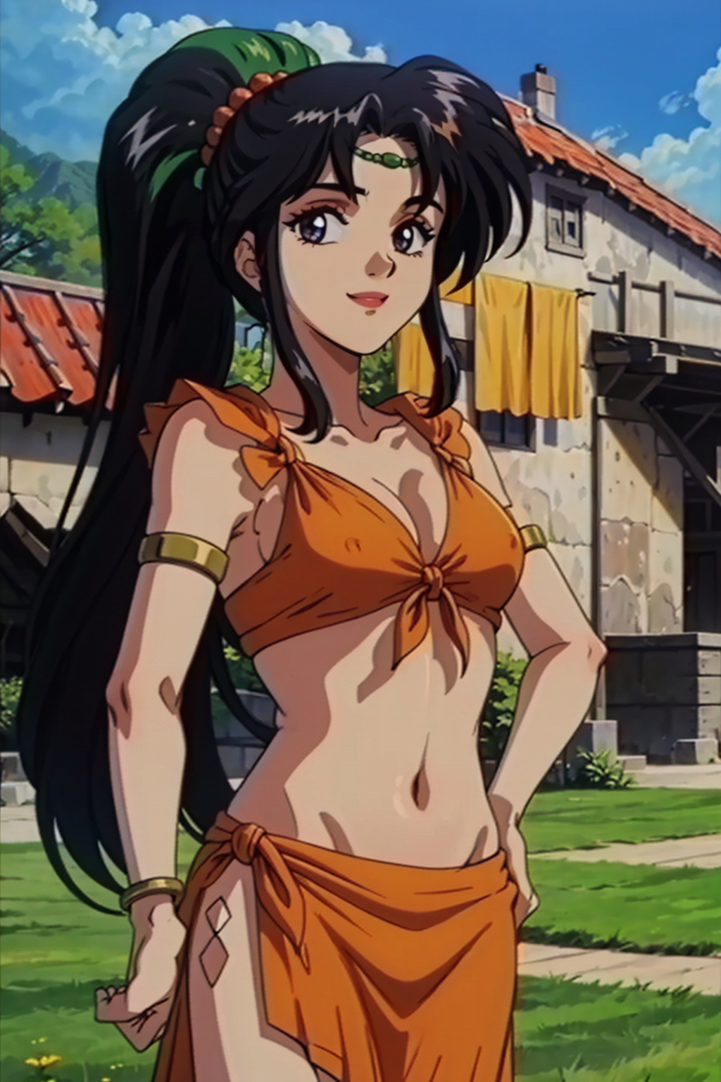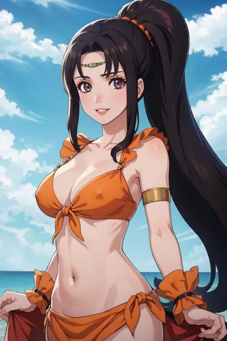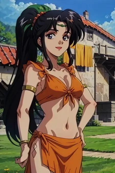彼女の通常の衣装は「お腹の露出、ポニーテール、頭輪、サロング、ジュエリー、胸元の露出」