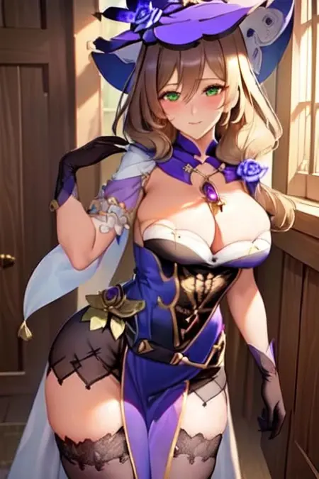 Trigger word: lisa_a, Lisa (Genshin) witch costume, witch purple hat, gloves, rose hair ornament, flower, black gloves, hair flower,