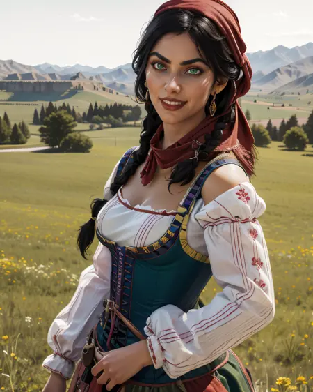 jewelry, earrings, red bandana, dress, corset, long skirt, belt, necklace,