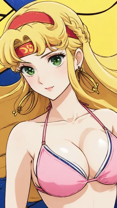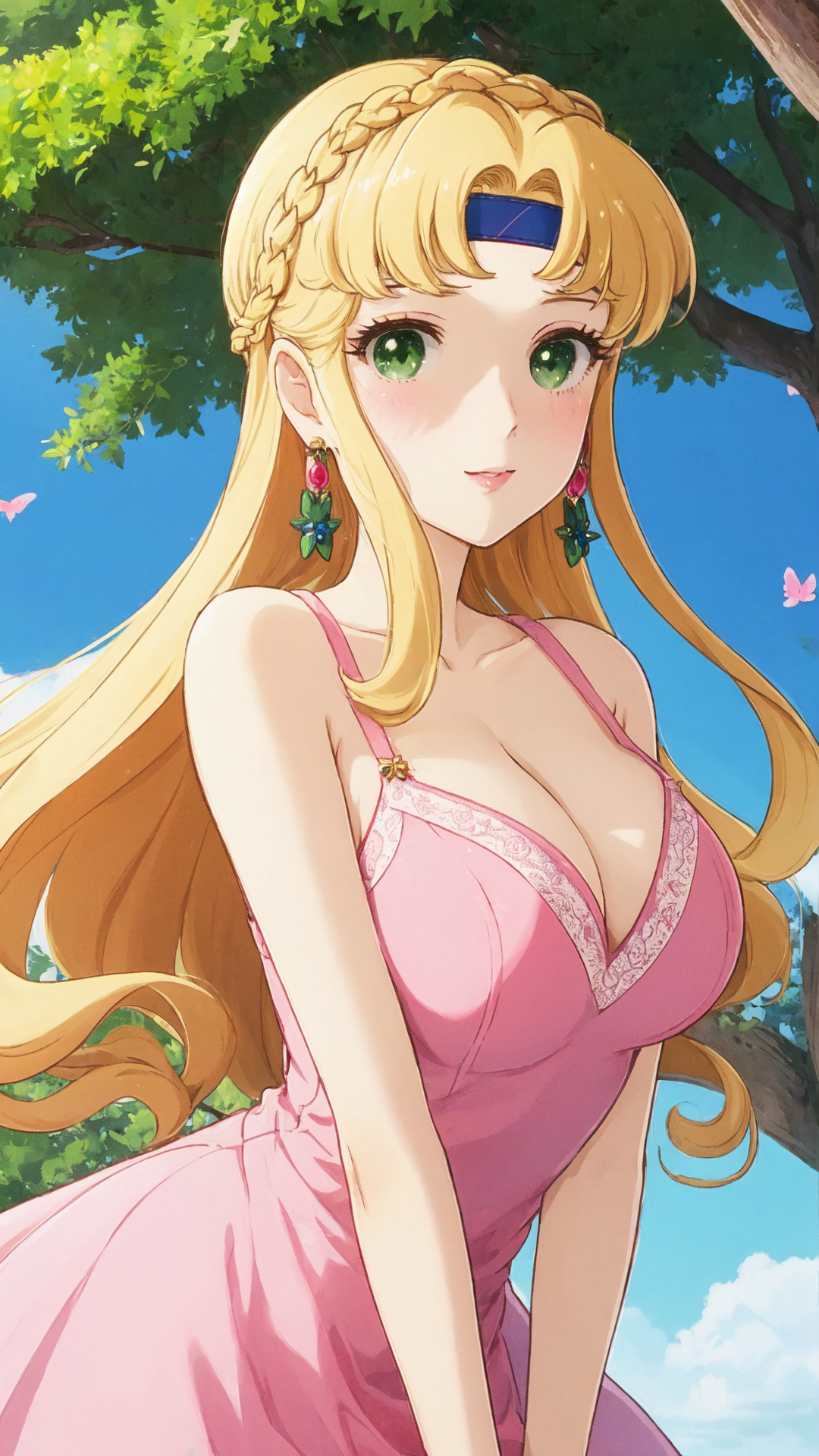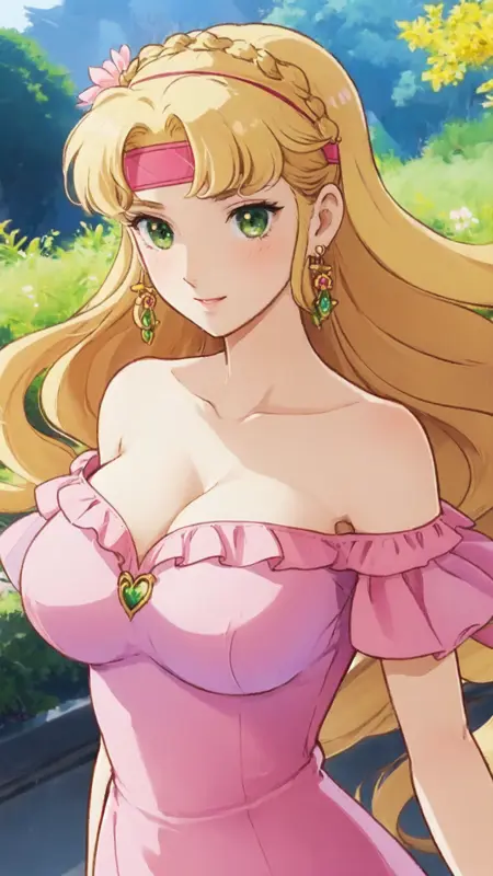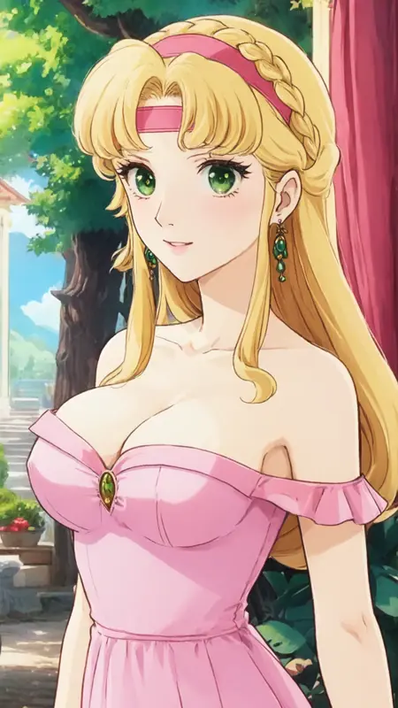 ピグマリオ, 精霊オリエ, Seirei Orie, blonde hair, long hair, bangs, Head banded, green eyes, Big Breast, Cleavage, earrings, jewelry, pink dress, Off Shoulder Low-Cut pink Dress,