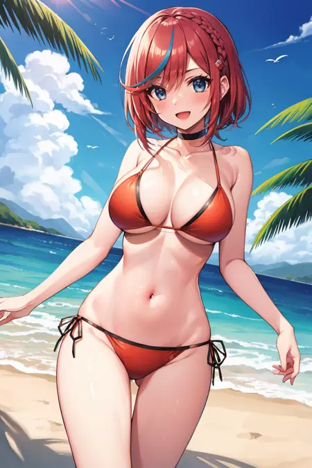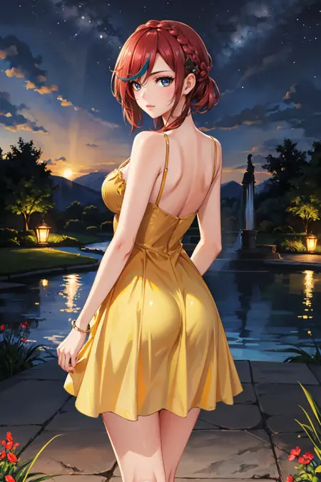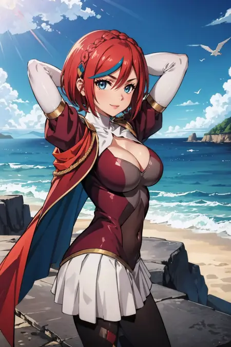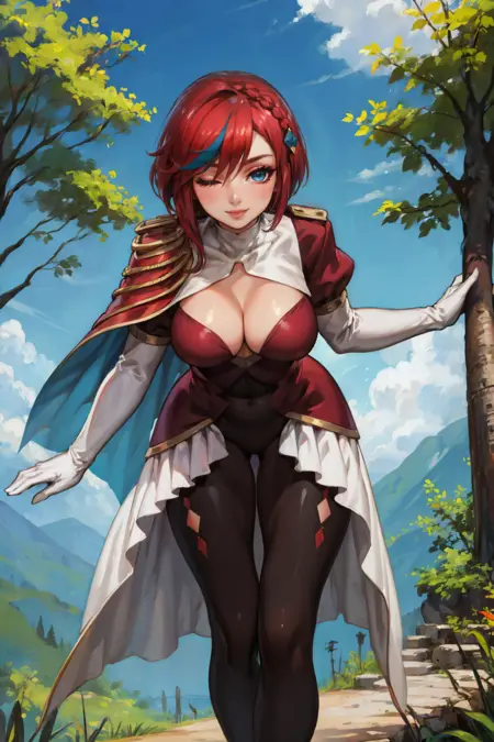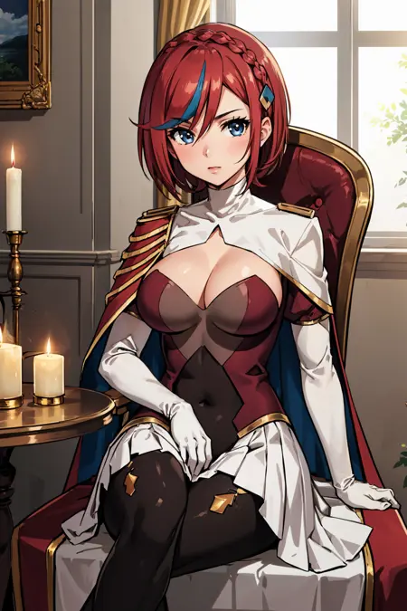Add "hair ornament, red dress, cape, cleavage cutout, white overskirt, black pants" for her typical look.