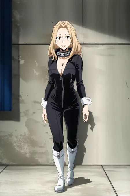 amie Utsushimi, 1girl, solo, breasts, hat, bodysuit, cleavage, boots, full body, hand on hip, peaked cap, white background, black bodysuit, large breasts, standing, one eye closed, blonde hair, simple background, looking at viewer, long hair, white footwear, unzipped, smile, wrist cuffs, brown eyes, knee boots, shadow, zipper