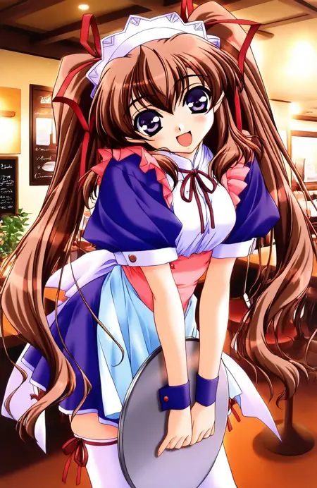 purple waitress, red ribbon, maid, white thighhighs, white apron, red sash, maid headdress, wristband, skirt, frills, short sleeves, bent over, leaning forward, puffy sleeves, wrist cuffs, puffy sleeves, wrist cuffs,