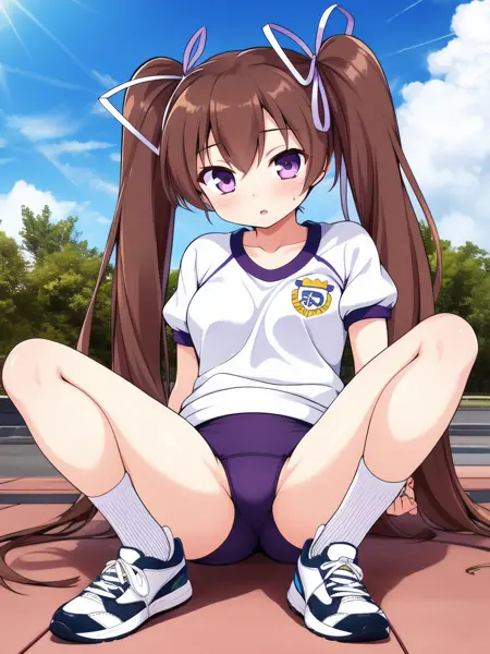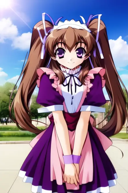 Aizawa_Tomomi, 1girl,solo, twintails, brown hair, very long hair, hair ribbon, purple eyes,