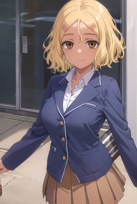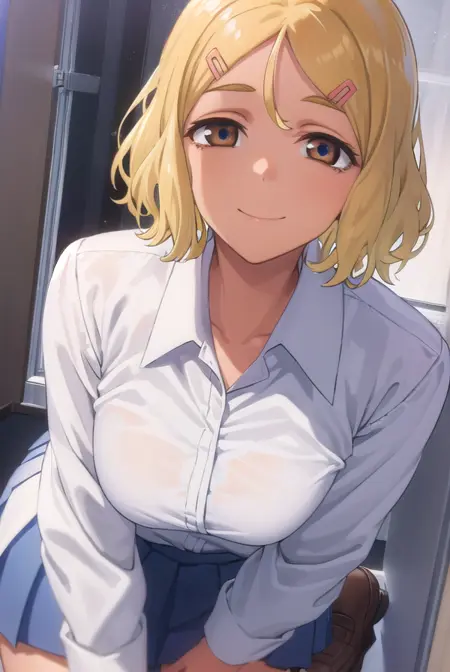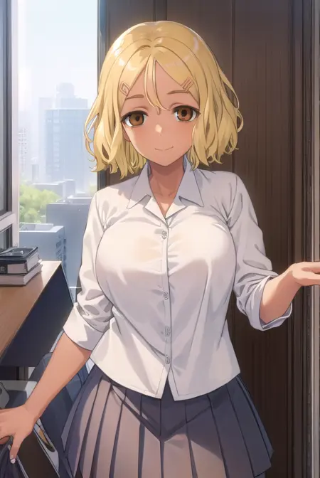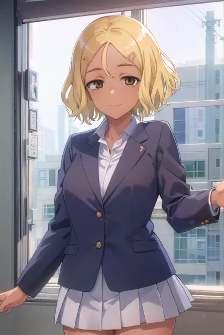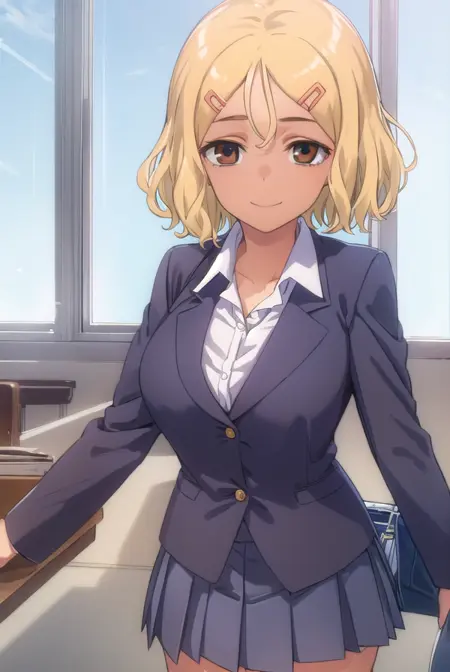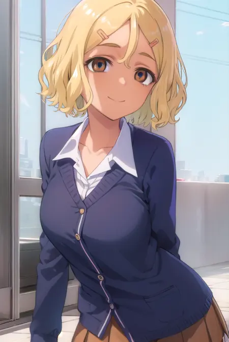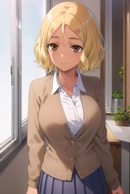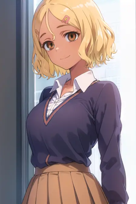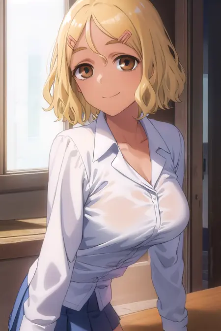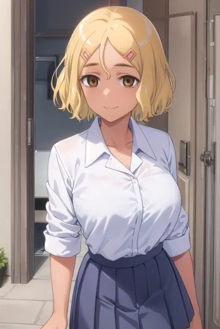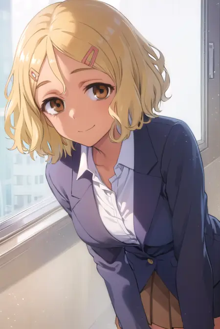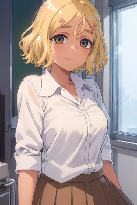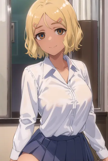 sakura, short hair, blonde hair, hair ornament, (brown eyes:1.5), hairclip, dark skin, dark-skinned female,