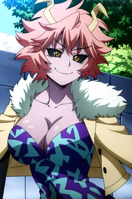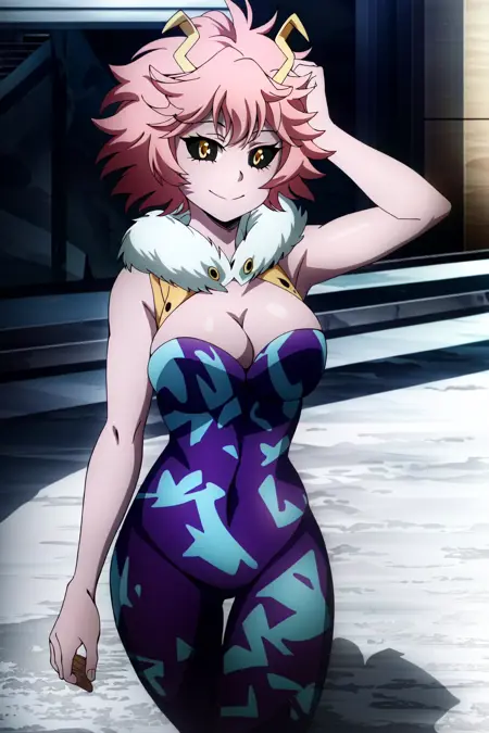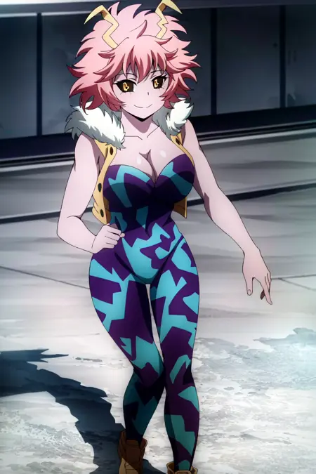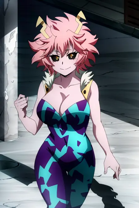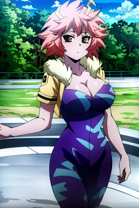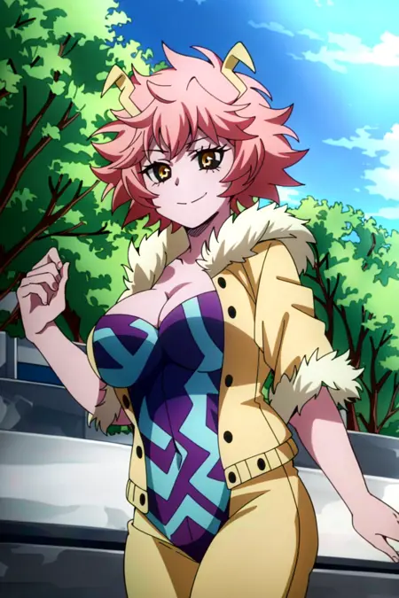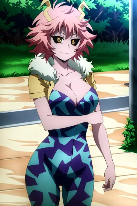 Mina Ashido, ashido mina, 1girl, black sclera, pink skin, horns, pink hair, colored sclera, solo, unitard, breasts, yellow eyes, colored skin, cleavage, short hair, large breasts, bodysuit, outdoors, smile