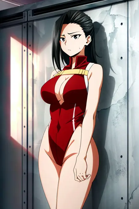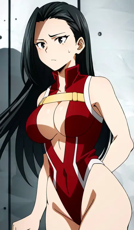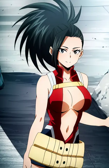 Momo Yaoyorozu, 1girl, breasts, solo, yaoyorozu momo, center opening, black hair, navel, large breasts, cleavage, leotard, red leotard, high ponytail, cape, ponytail, standing, black eyes, bangs, light smile, belt, beltskirt, turtleneck, looking at viewer, outdoors, hair pulled back, long hair, wide ponytail, halterneck, sky, day, loose belt