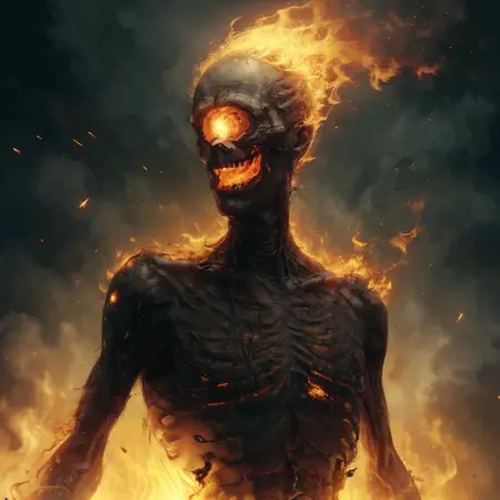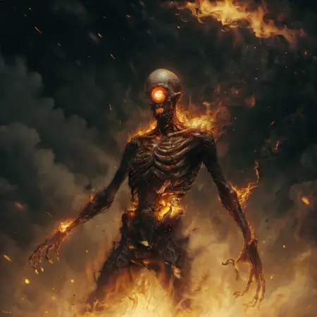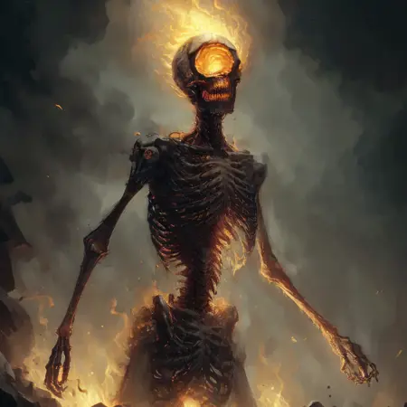 1other, bone, burning, claws, embers, fadroosh, fire, flame, floating, full body, glowing, glowing eye, glowing eyes, legs, no humans, one-eyed, open mouth, ribs, sharp teeth, skeleton, solo, standing, teeth, upper body,