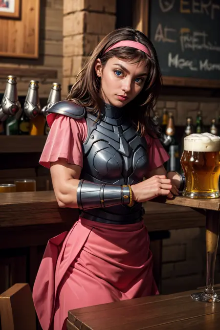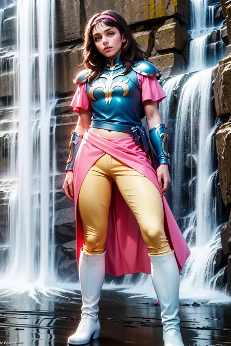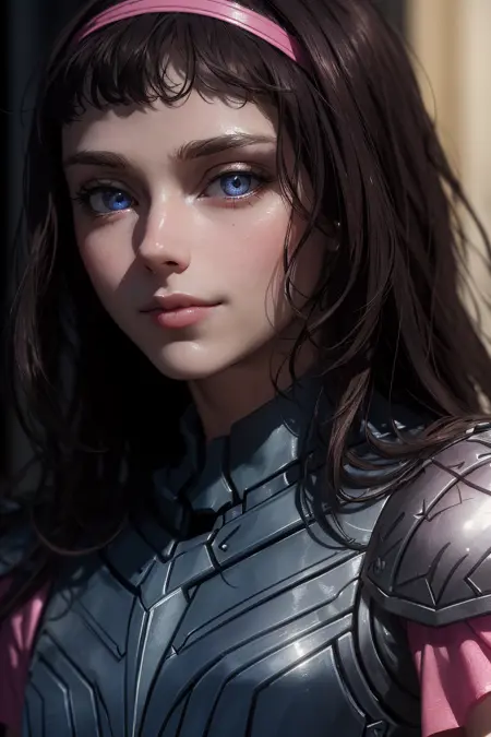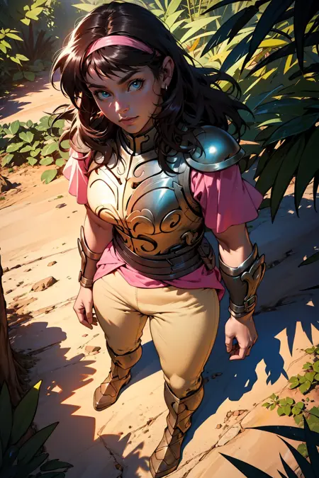 또한: 헤어밴드, 어깨 갑옷, 분홍색 소매, (가슴) 갑옷, 벨트, 팔찌, 분홍색 치마, 베이지색 바지, 흰색 부츠
