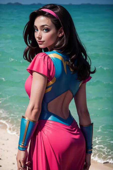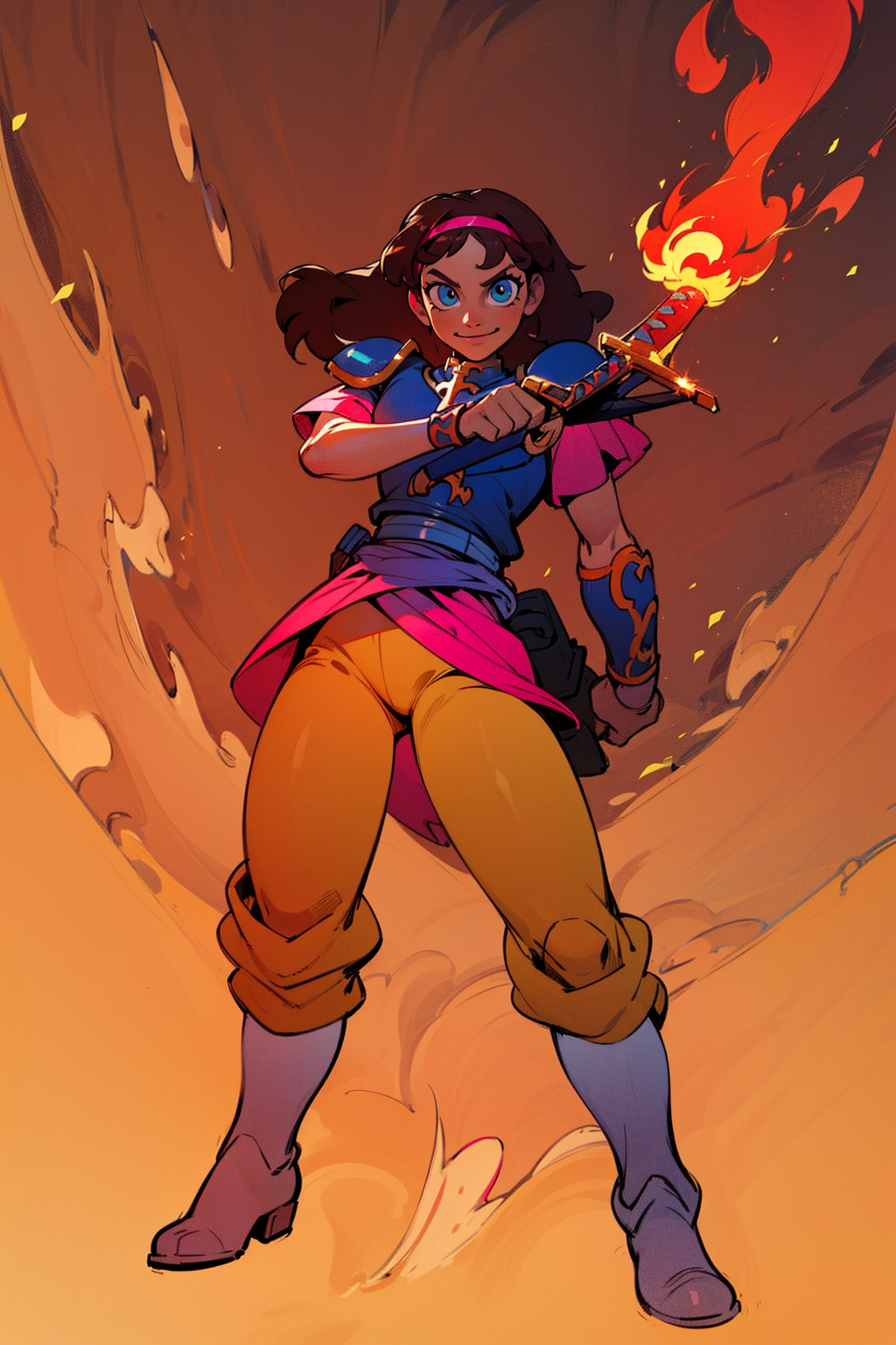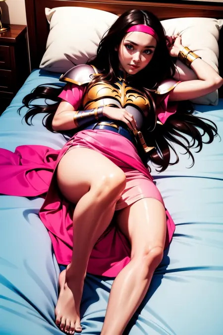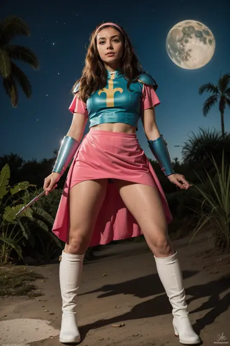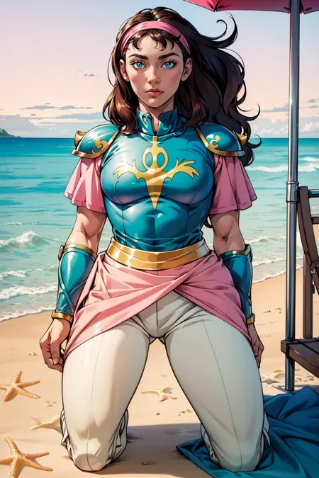 also: hairband, shoulder armor, pink sleeves, (chest) armor, belt, bracelets, pink skirt, beige pants, white boots