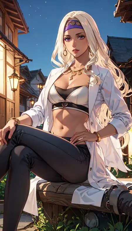 长发,金发,深色皮肤,粉红色眼睛,紫色发带,敞开的实验服,上衣,黑色长裤,肚脐,项链,手镯,耳环