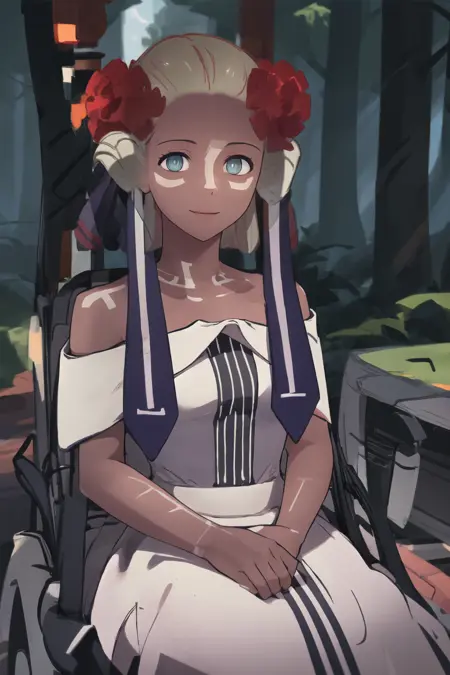 Main Appearance: "HMain, facial mark, bodypaint, hair flower, hair ribbon, short hair, white dress, strapless, off shoulder, bare shoulders, sleeveless, white sash, vertical-striped dress"