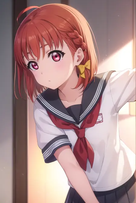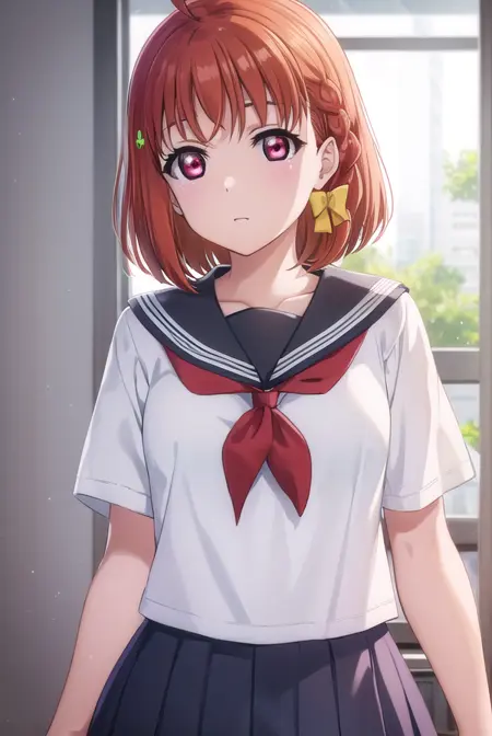 chika takami、短い髪、髪飾り、(赤い目:1.3)、リボン、編み髪、あほげ、髪のリボン、オレンジ色の髪、片側編み髪、黄色いリボン、三葉草の髪飾り、