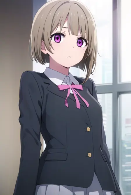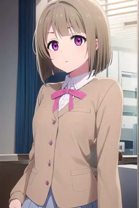 kasumi nakasu、ショートヘア、前髪、茶色の髪、(ピンクの目:1.3)、ボブカット、薄茶色の髪、非対称な髪型、