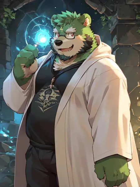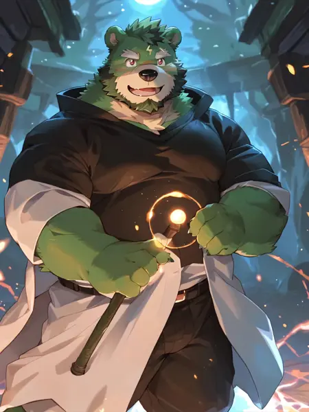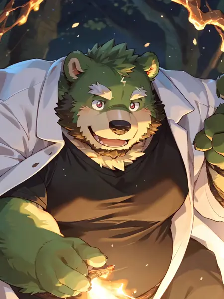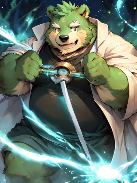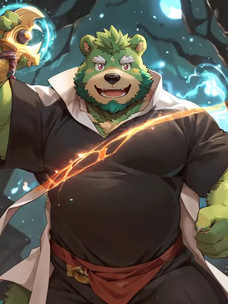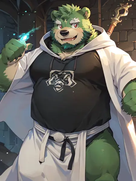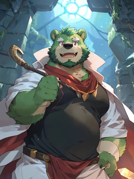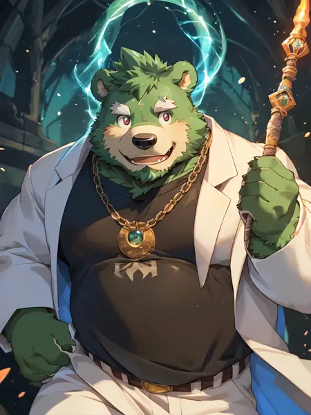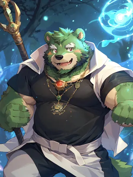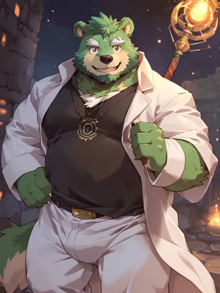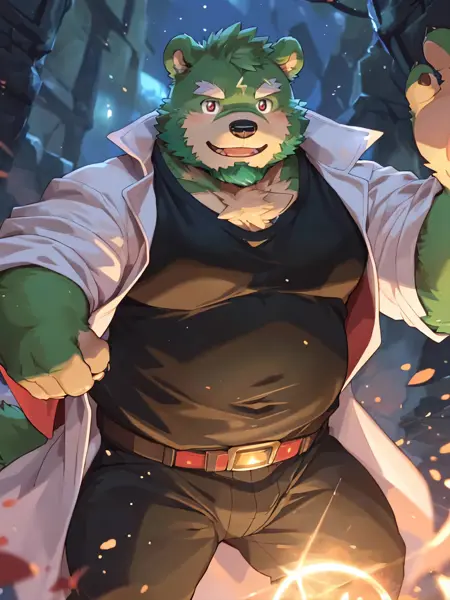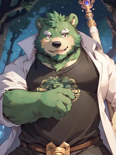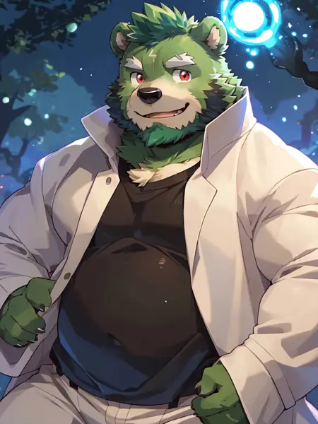• Recommended prompts: anthro, kemono, ((mature)), (((green bear))), (((beard))), (((white mouth, white chest and belly, white eyebrows, scar eyebrow, red eyes))),