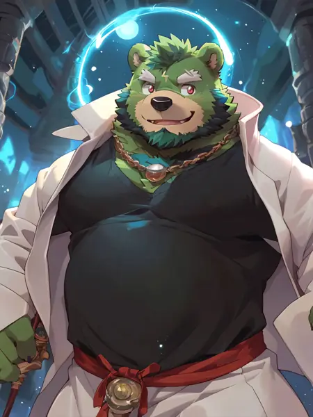추천 프롬프트: anthro, kemono, ((성인)), (((녹색 곰))), (((수염))), (((흰색 입술, 흰색 가슴과 배, 흰색 눈썹, 흉터 눈썹, 빨간 눈))),