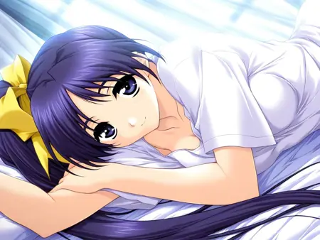 Itou_Noemi(With_You), 1girl, solo, very long hair, blue hair, side ponytail, blue eyes, hair bow, yellow bow, medium breasts,