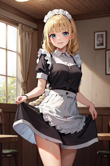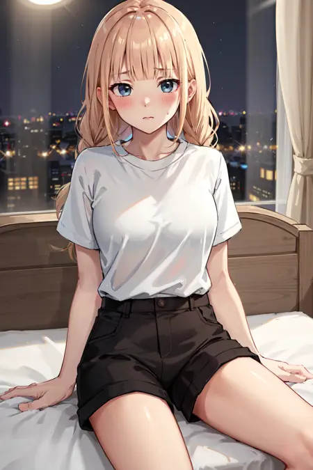 • tsukimi eiko, 모자, 검정 머리장식, 긴 머리, 더블 브레이드, 둔한 앞머리, 셔츠, 흰 셔츠, 짧은 소매, 반바지, 검정 반바지, 운동화, 녹색 신발