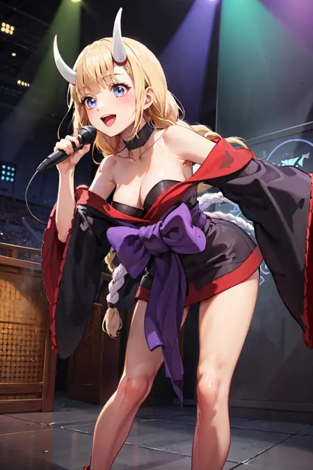 • tsukimi eiko, 뿔, 긴 머리, 더블 브레이드, 둔한 앞머리, 쇄골 목걸이, 어깨 노출, 김코, 검정 김코, 넓은 소매, 오비, 보라색 리본, 모래신발, 빨간 신발
