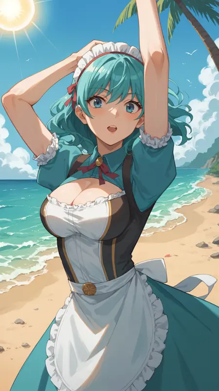aqua hair, medium hair, blue eyes, aqua maid dress, maid headdress, frills, apron,