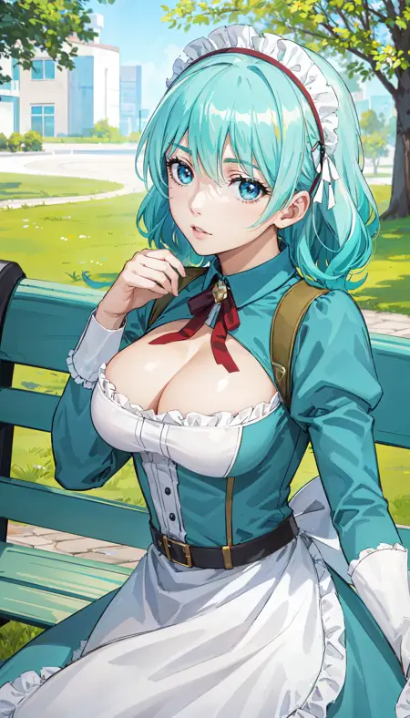 水色头发,中长发,蓝眼睛,水色女仆裙,女仆头饰,花边,围裙,